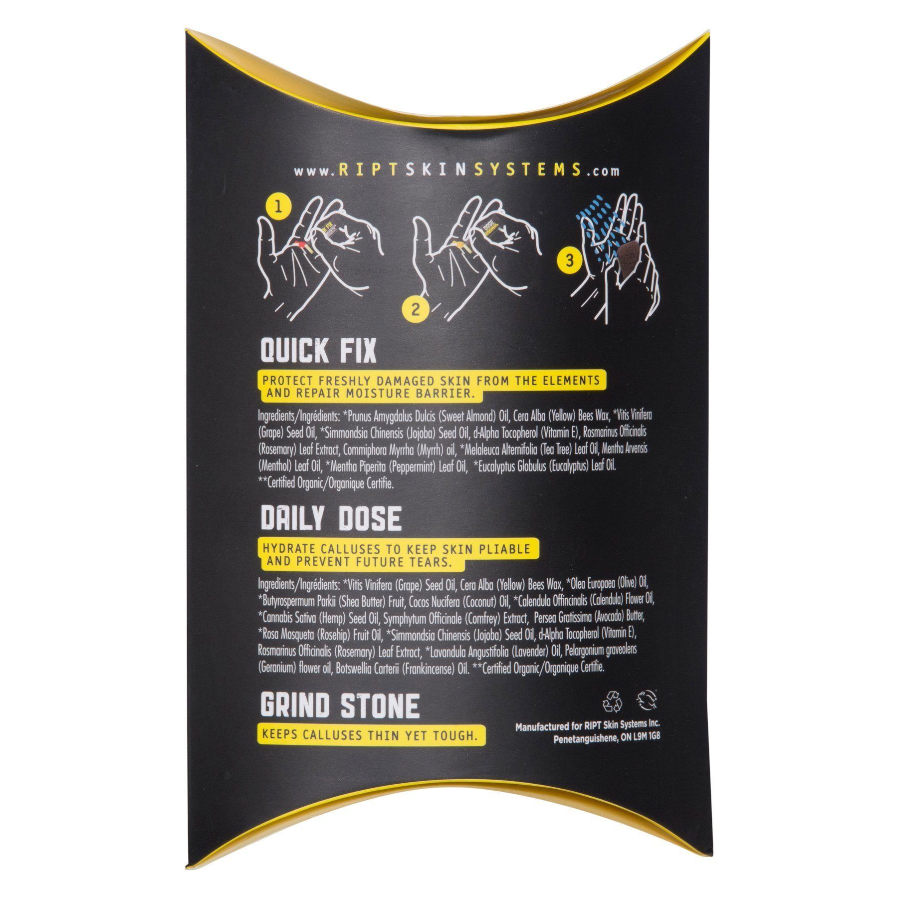 RIPT just isn't your normal hand lotion. It has a tonne of high-potency ingredients to enhance skin repair. If the ingredient doesn’t promote skin repair, it’s not in a tube of RIPT. The kit also contains a grind stone to assist in keeping your calluses even, thin and well maintained which performs best when used in the shower or when wet.